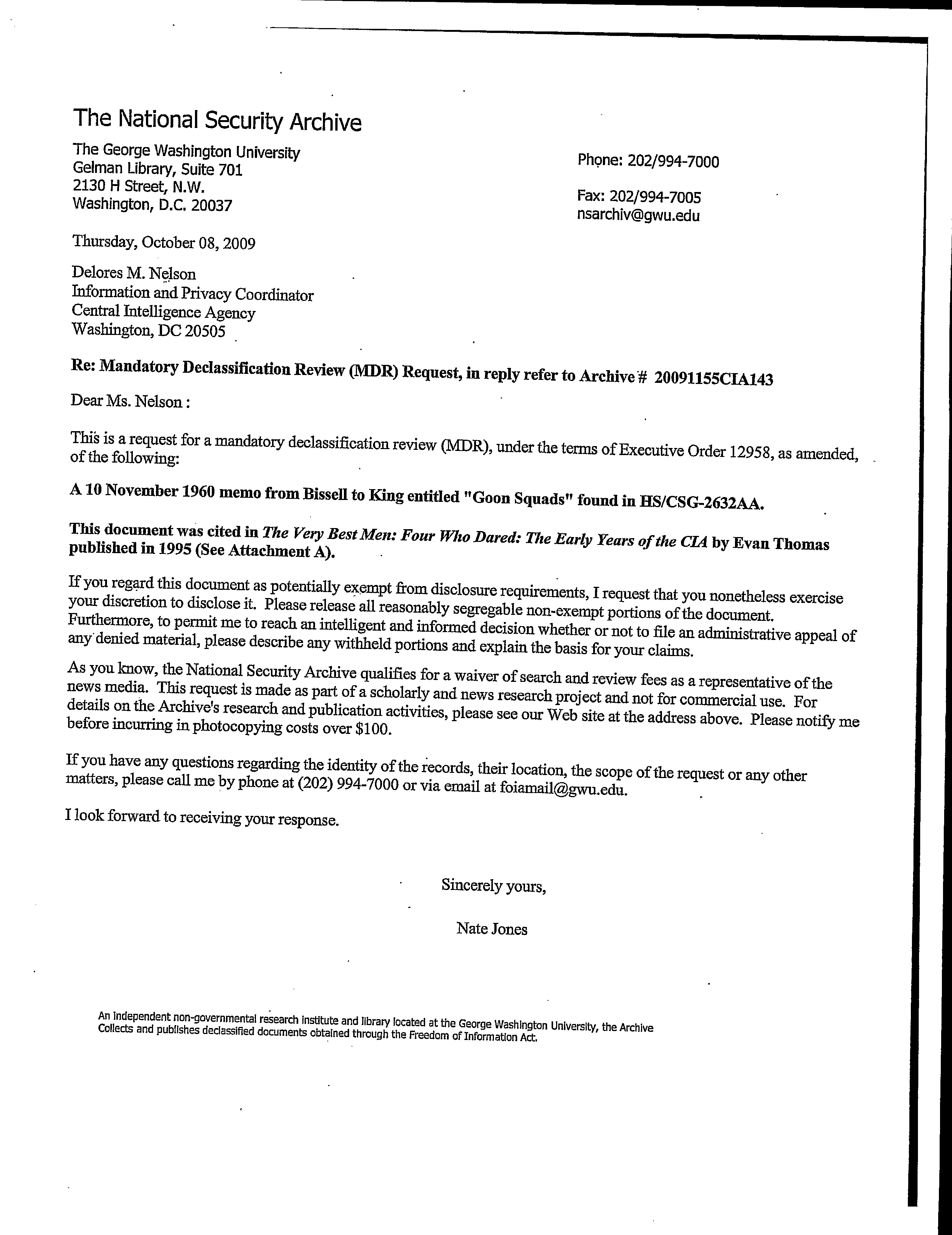 Last year, I combed through Evan Thomas’s history of the CIA entitled The Very Best Men. It’s a pretty fluid and fun read, but what makes the book really interesting to historians is that the CIA granted Thomas limited but unprecedented access to its records while he was writing. I used the works he cited as leads to fire off some Mandatory Declassification Review requests to the CIA. (Click here to see when to use MDR and when to use FOIA.) Here’s one below: