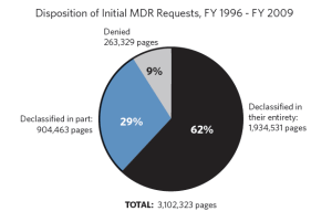The report also provides a very intriguing breakdown of the Mandatory Declassification Review process. The report shows that MDR backlogs are growing and that “agencies have been unable to keep pace with the influx of initial requests.” Of the 3,102,323 pages of MDR requests processed between FY 1996 and FY 2009, 62 percent were declassified in full, 29 percent were declassified in part, and only 9 percent were denied. Of the 66,555 pages of MDR requests that were administratively appealed within the agencies, 17 percent were declassified in full, 43 percent were declassified in part, and 40 percent were denied. Finally, of the 841 documents reviewed by Interagency Security Classification Appeals Panel (the final chance to argue for a document’s release under MDR), 22 percent were declassified in full, 43 percent were declassified in part, and 35 were denied. The lesson to requesters: ALWAYS EXHAUST YOUR APPEALS. As the statistics indicate, MDR is a highly effective mechanism for citizens to access classified documents; it is in the public interest that the Reviews are expedited and backlogs eliminated.