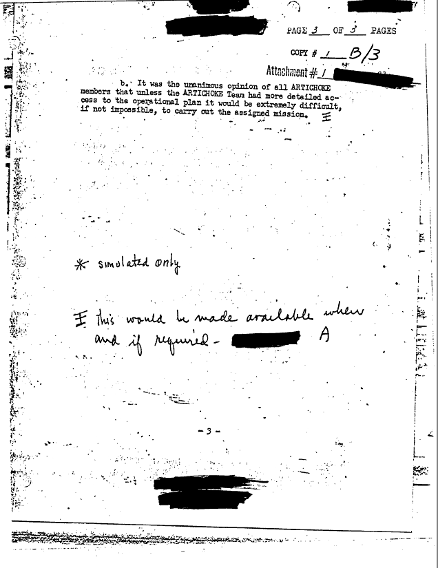 Despite these limitations, the report still stressed that a “crash course” could be possible. If headquarters provided greater access to operational plans and gave the order, “the ARTICHOKE Team would undertake the problem in spite of the operational limitations.” A final, handwritten notation at the end of the document reiterated, “This would be made available when and if required.”