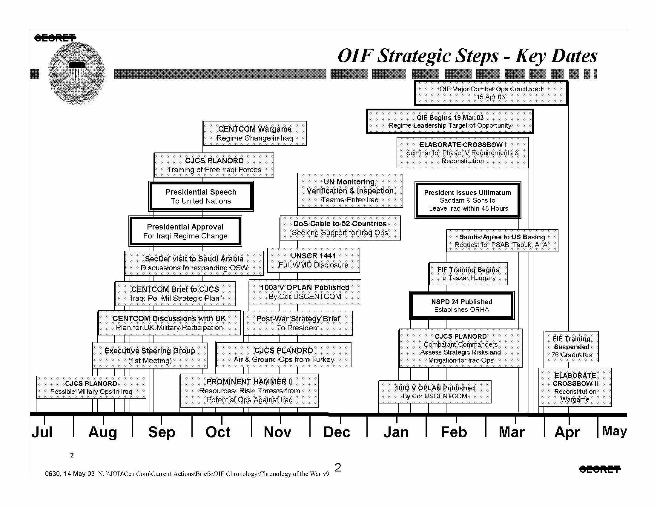A recently declassified Joint Chiefs of Staff Operation Iraqi Freedom (OIF) History Brief gets it dead wrong. According to the JCS, the United States military did not begin planning for the 2003 invasion of Iraq until 9 July 2002, less than two months before President George W. Bush “approv[ed] overthrow of Saddam Hussein” on 29 August 2002. The Pentagon’s propagation of such an untrue history further underlines the importance of the National Security Archive’s recent three-part, document-supported expose –written by Joyce Battle, John Prados, and Christopher Ames– on the run-up to the 2003 Iraq war.