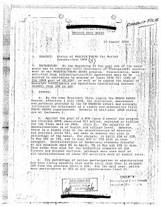 The August 10, 1968 ten-page document that we selected gives a complete overview of the “Phoenix” program after its first half year of operation. It shows clearly that Phoenix was based upon “goals” for the number of enemy to be “neutralized.” It was compiled by the Reports Branch of the central Phoenix Directorate in Saigon, part of CORDS, the overall U.S. pacification organization (Civil Operations and Rural Development Support). The Phoenix Fact Sheet provides a numbers-based impersonal summary of a program that relied on subjective and often uncorroborated evidence against individuals in hamlets and villages.