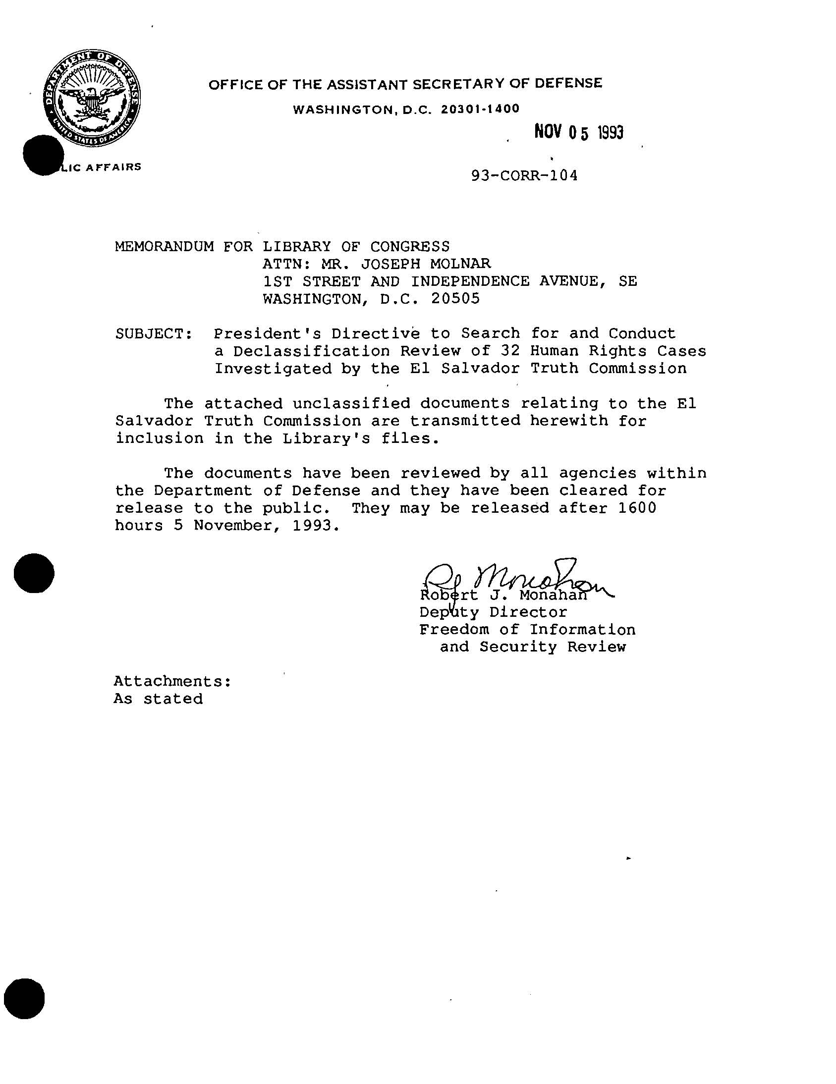Letter from the Office of the Secretary of Defense describing documents given to the Library of Congress