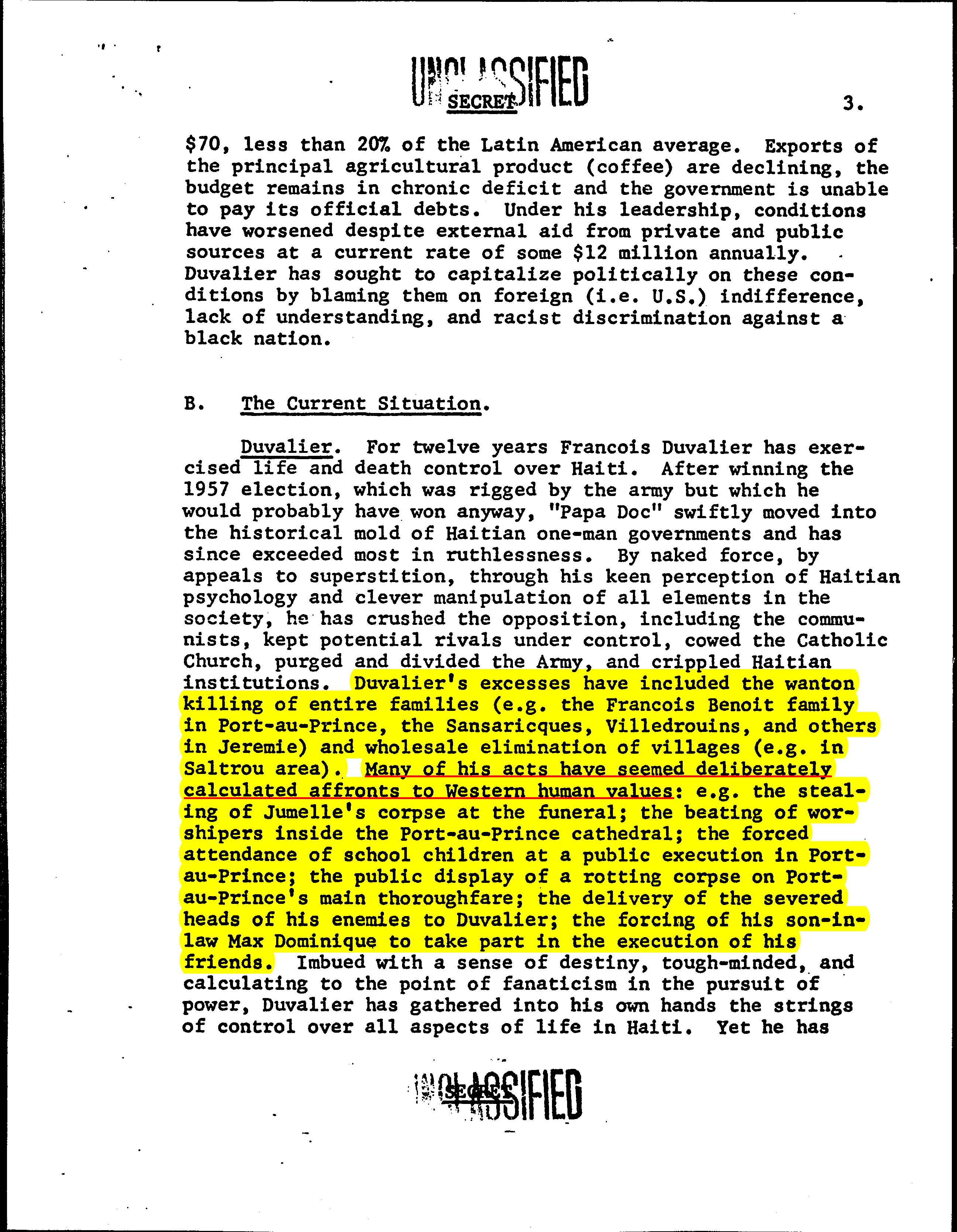 According to a 1970 US Interdepartmental National Security Study Memorandum, “Many of [Papa Doc’s] acts have seemed deliberately calculated affronts to Western human values.” The affronts included: “the wanton killing of entire families…the wholesale elimination of villages…the stealing of [a rival’s] corpse at a funeral; the beating of worshipers inside of Port-au-Prince cathedral; the forced attendance of school children at a public execution…the public display of a rotting corpse on Port-au-Prince’s main thoroughfare; the delivery of the severed heads of his enemies to Duvalier; [and] the forcing of his son-in-law Max Dominique to take part in the execution of his friends.”