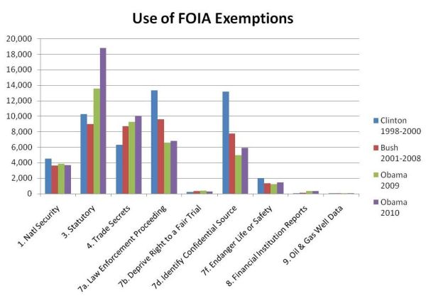 Second, OMB Watch also highlighted the alarming increase of exemption 3 ( known as the statuary exemption). Basically, exemption 3 allows Congress to pass any law, which can exempt any document from FOIA. This exemption was most prominently used in May 2009 when the President Obama exempted photographs of prisoner abuse by American soldiers at the Abu Ghraib Prison in Iraq from FOIA requests. A statutory exemption is also the CIA’s favorite tool to deny information to requesters.