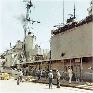 The Ozbourn on 25 March 1967; note impact points at fore and aft. From the U.S.S. Ozbourn Association http://www.ozbourn.org/index.htm