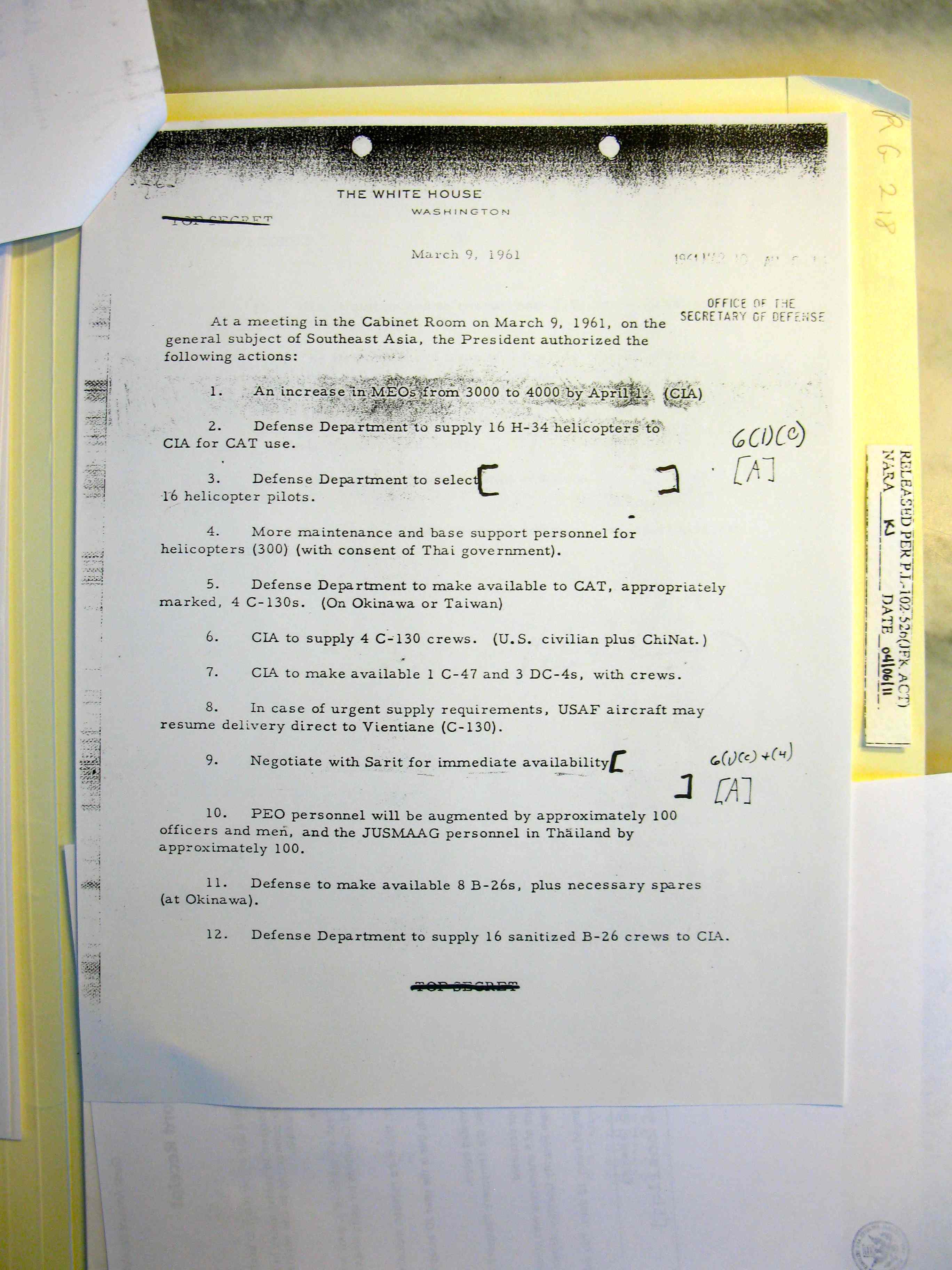 We are thinking of starting a betting pool on whether the copy of Kennedy’s Laos directive that is filed in the Joint Chiefs’ Records Group 218 is still secret. Any takers?
