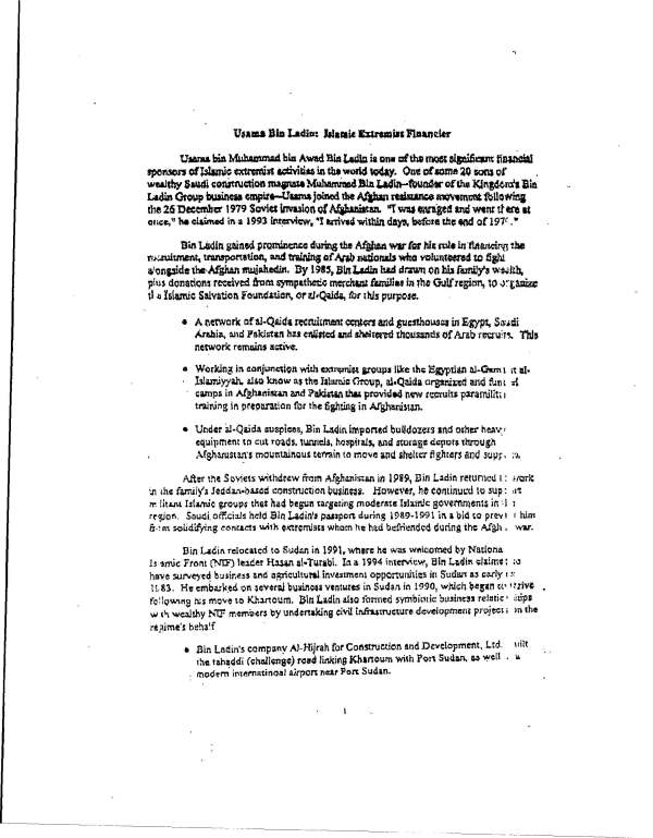 The Al Qaeda leader Osama Bin Laden, killed in Pakistan by U.S. special operations forces yesterday, ranked as “one of the most significant financial sponsors of Islamic terrorist activities in the world” as early as 1996, according to declassified U.S. documents posted on the web today by the National Security Archive at George Washington University (www.nsarchive.org).