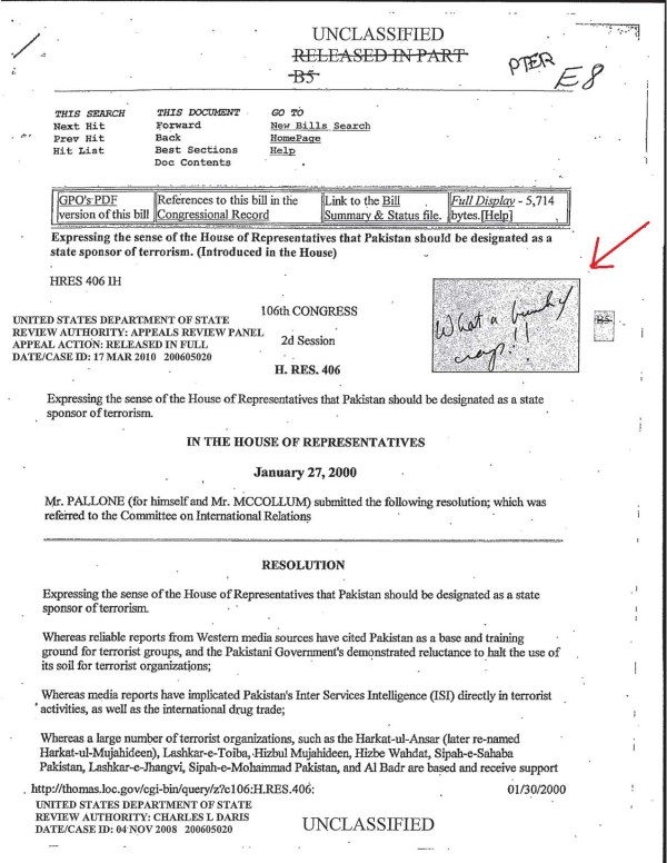 Let’s start with the history. As you can see, “What a bunch of crap!!” was scrawled on a copy of House Resolution 406 that “express[ed] the sense of the House of Representatives that Pakistan should be designated as a state sponsor of terrorism.” The resolution –submitted by a Democrat and a Republican to a Republican-controlled House– was eventually referred to a subcommittee where it died, perhaps for political reasons.
