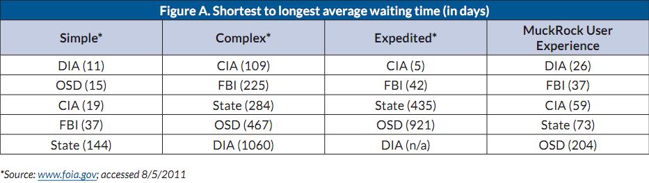 Delays in FOIA processing are only peripherally mentioned in the 2011 Knight Report, but OpentheGovernment.org gives the topic a more thorough treatment. Using an online tool called MuckRock, the survey presented FOIA waiting times for five significant agencies. Performance varied across the board when measuring wait times based on the government’s own system for prioritizing requests. The 2011 Knight Survey found evidence that the process of consultations was a source of friction within the FOIA process. Similarly to the current and previous Knight Surveys, OpentheGovernment.org cites existing backlogs, personnel issues, and inadequate resources and systems as likely causes of long wait times.