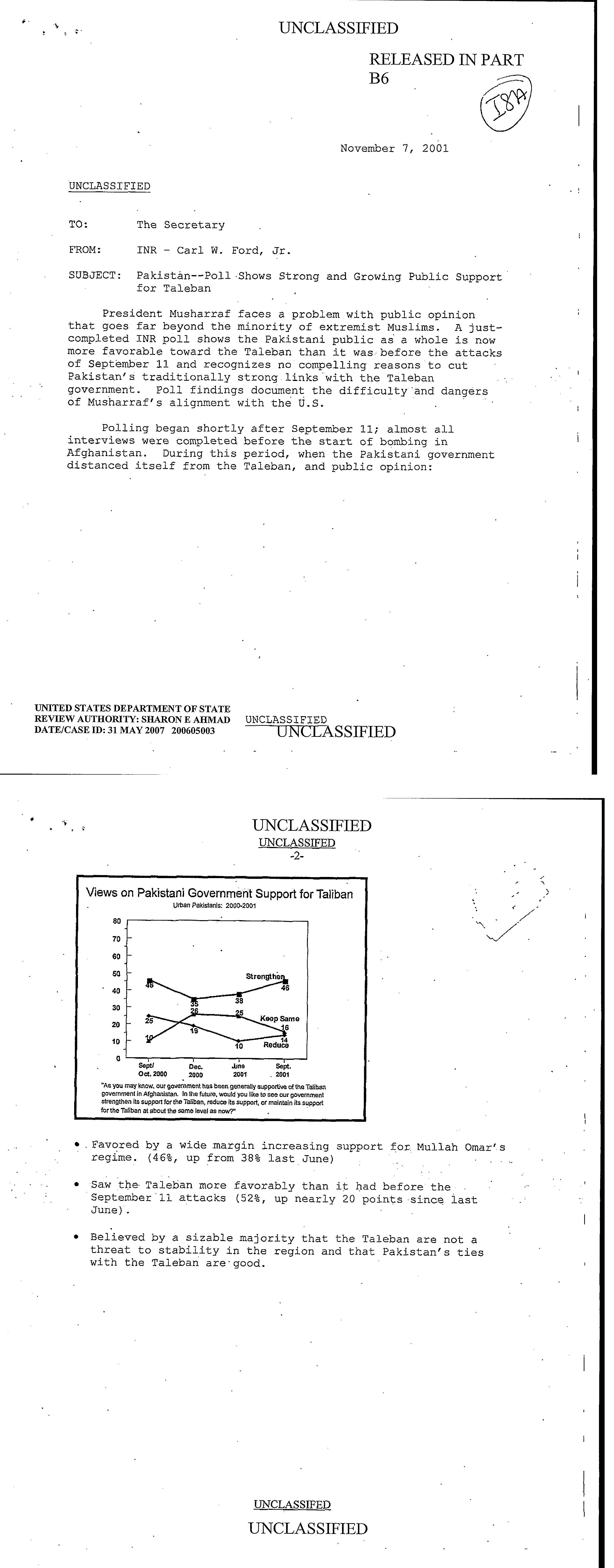Ford’s memo to Powell called these startling opinions –“that [went] far beyond the minority of extremist Muslims”– “General Musharraf’s problem.” Of course, Musharraf is long gone. The groundswell of Taliban support within Pakistan was –and is now– very much the United States’ problem.