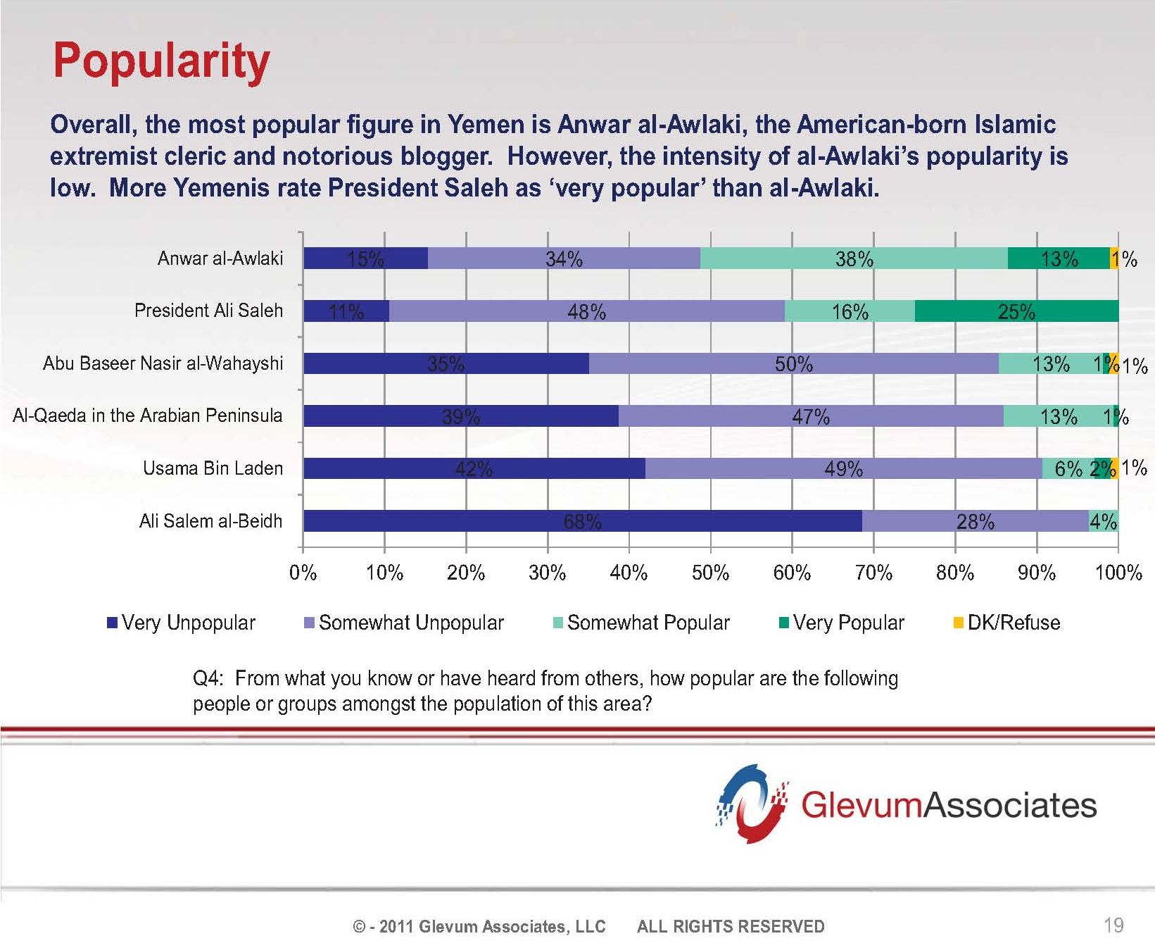And finally, on the heels on the US drone strike that killed US citizen Anwar al-Awlaki on Yemeni soil, I attempted to find some stats on the Yemeni public opinion towards him. They were scarce, but I was able to find this 2011Yemen Stability Survey by Glevum Associates, a firm that supports “decision makers engaged in combat operations.” (Whatever that means.) Here is by far the scariest statistic: