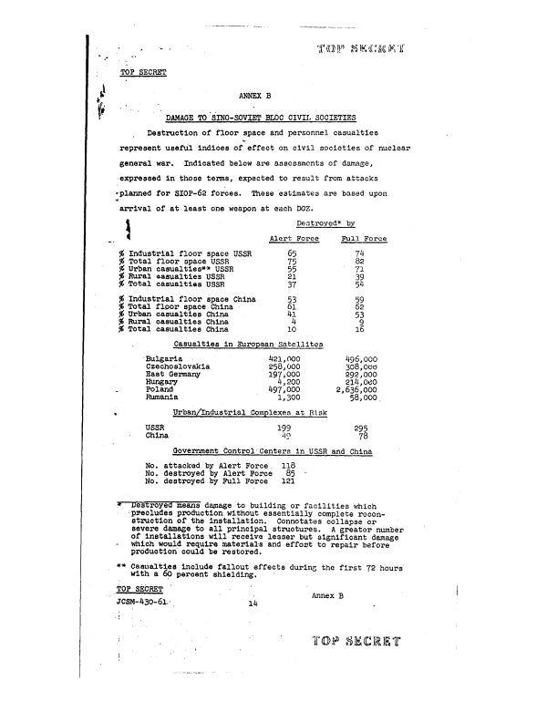 A recently declassified Joint Chiefs of Staff report on “Berlin Contingency Planning,” produced in June 1961 as the Berlin Crisis was heating up, includes horrific estimates of fatalities and destruction that the execution of U.S. war plans would cause to the Soviet Union and putative allies. According to the JCS, if the full U.S. nuclear force assigned to the Single Integrated Operational Plan (SIOP) struck the Soviet Union, 54 percent of the total population would be killed, that is some 108 million of a total population of 217 million. If the smaller alert force (bombers on 15 minute to 2 hour alert) was used, total Soviet casualties would be 37 percent or about 80 million. Against China, the full force would kill a smaller proportion because there were fewer cities: 16 percent of an estimated 650 million or about 104 million.[1] Poland, the site of Soviet air defense installations, would suffer 2,636,000 million casualties in an attack by the full force. The report, sent to Secretary of Defense Robert McNamara, was for National Security Adviser McGeorge Bundy to use for answering questions posed by White House adviser and former Secretary of State Dean Acheson.[2]