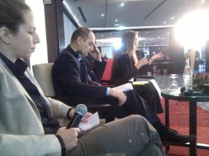 » Farah Hachad, Virgiliu-Leon Tarau, and Kate Doyle speaking at conference