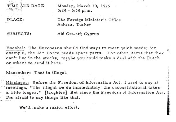 […] favorite FOIA tidbit is a revelatory quote from the minutes of a March 10, 1975 meeting between Secretary of State Henry Kissinger and Turkish Forei…, who was expressing his displeasure with the arms embargo on Turkey passed by Congress after Turkey […]