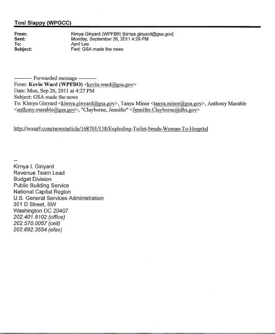Last September, Washington-area inboxes, gchats, and facebook walls went into the gutter sewer after a news article entitled “Exploding Toilet Sends Woman to Hospital” began making the rounds. The explosion occurred at the GSA offices at 301 7th St. SW, and at least one woman was injured badly enough that she needed to go to the hospital. I haven’t found an update on her status. After the bad PR, the GSA sent out a press release, and the story eventually disappeared down the pipes .