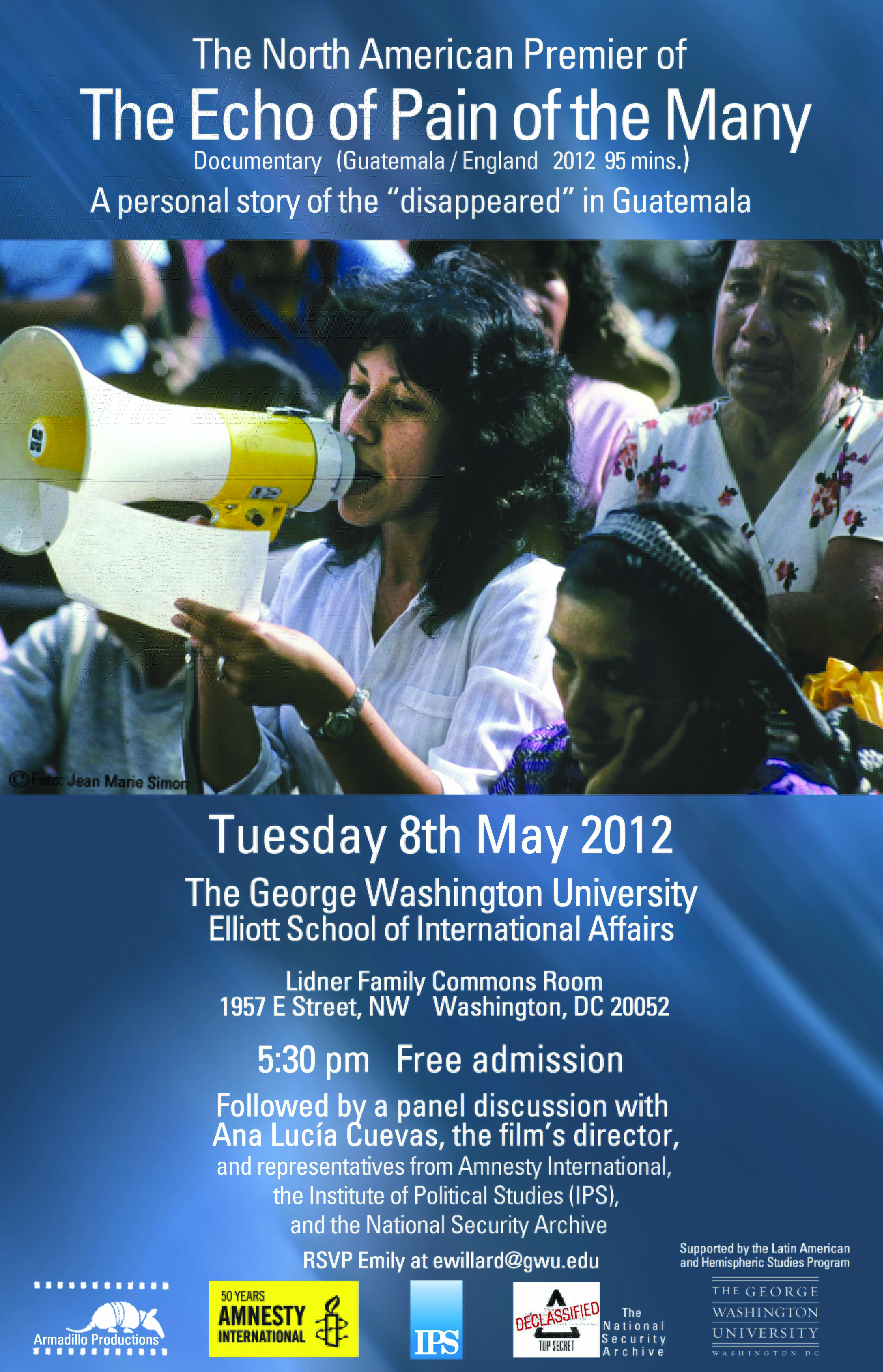 *The premier will be followed by a panel discussion with Ana Lucia Cuevas, director of “The Echo,” Iduvina Hernandez, Guatemalan journalist and human rights defender, and representatives from the National Security Archive and Amnesty International. The film is in English and Spanish with English subtitles.