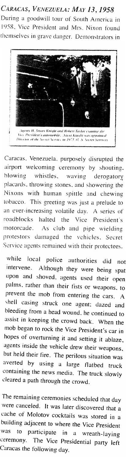 On May 13, 1958, Vice President and Mrs. Nixon arrived in Venezuela for a stop on a Latin American goodwill tour. Upon landing, unfriendly Venezuelans “purposely disrupted the airport welcoming ceremony by shouting, blowing whistles, waving derogatory placards, strowing stones, and showering the Nixons with human spittle and chewing tobacco.”