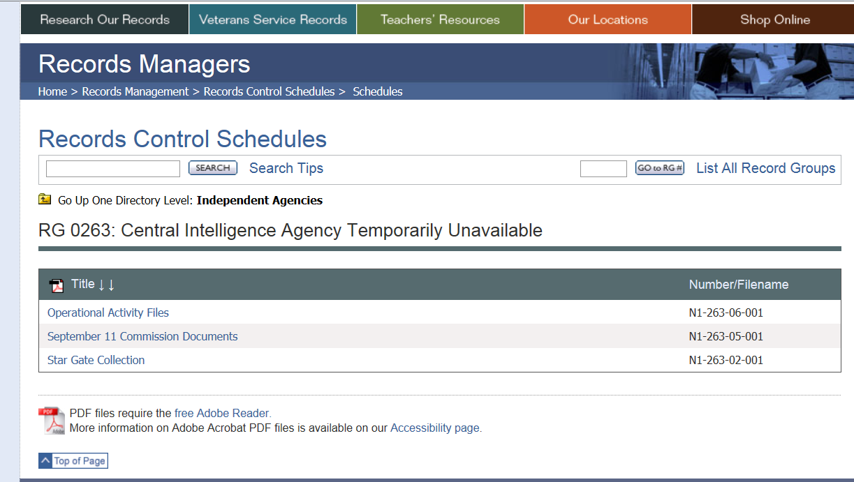 These control schedules – and two dozen more – were available on the NARA portal for several months in 2010. However, since the middle of 2010 the schedules for the CIA have been temporarily unavailable – for almost two years now. Today, the only three CIA schedules available are the Operation Activity Files, the Star Gate Collection, and some September 11 Commission Documents. Exactly why the record control schedules have been unavailable for so long is not expressly clear, though it’s clearly against NARA’s mission statement, and a disservice for anyone trying to learn more about the way the CIA operates. Then again, that may be the point.