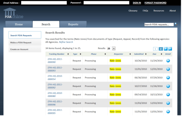 To demonstrate how searchable the site is, I conducted a simple search for my colleague and prolific FOIA requester, Nate Jones. The screenshot below shows the results of my search, including the phase his requests are in, and their agency tracking numbers.