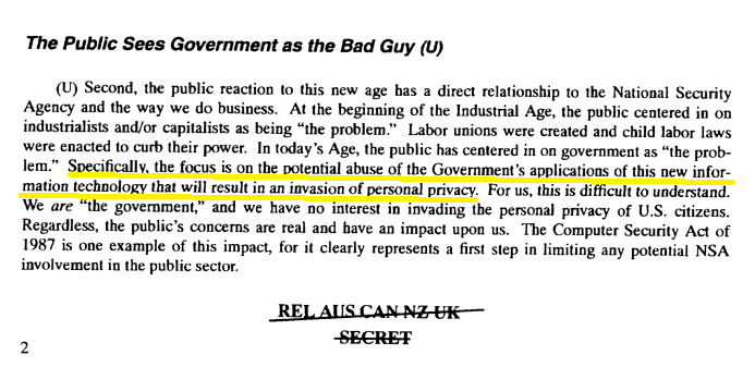 A paragraph from a declassified Secret NSA document from 1997 laments the public’s interpretation of the government, specifically the NSA, as the bad guy, quoting, “Specifically, the focus is on the potential abuse of the Government’s applications of this new information technology that will result in an invasion of personal privacy.” Notice the ounly countries the document was released to were Australia, Canada, New Zealand and the UK – all members of the ECHELON Spy Network.