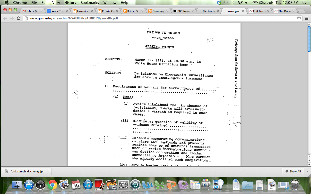 FISA was signed into law by President Carter, but the debate over the NSA’s warrantless wiretapping began during the Ford administration. A March 1976 memo from White House counsel Philip Buchen details President Ford’s ultimate support of legislation to regulate the NSA’s wiretapping of American citizens only after strong objections from Donald Rumsfeld, G.H.W. Bush, and Henry Kissinger were overcome. The Ford administrations’ internal decision-making process involved making several “pros” and “cons” lists. The “cons” lists included the argument that oversight of wiretapping policies “requires resort to the judiciary for exercise of an inherent Executive power.” On the “pros” side was the winning argument that legislation would provide legal protection for government officials and telecommunications companies from criminal liability for wiretapping, a practice they were likely going to continue with or without the legislation. At least with legislation in place they would be legally covered for doing it.