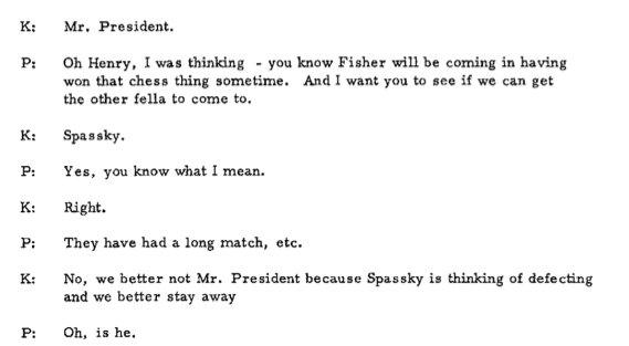 Jokes in bad taste aside, Kissinger’s intervention convinced Fischer that it was his American duty to play, and he became a national hero after beating Spassky –the personification of Western superiority over the Soviets. Spassky was less fortunate. A telephone conversation between Kissinger and President Nixon from November of that year records Kissinger advising the president not to invite the Soviet chess grandmaster to the U.S. on account of rumors that he was thinking of defecting.