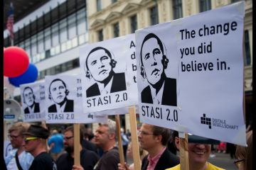 Protestors in Germany oppose NSA spying. The affair is complicated by the fact that many Europeans already share a great deal of intelligence with the US, and the US takes European concerns into account when processing FOIA requests. (JOHANNES EISELE/AFP/Getty Images)