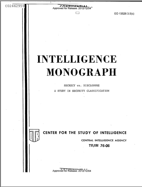The Reducing Over-Classification Act of 2010, a byproduct of the 9/11 Commission Report‘s finding that overclassification and lack of intelligence sharing led, in part, to the 2001 terrorist attacks, mandated reductions in overclassification. However, the Act failed to define what “overclassification” meant, and missed the larger problem of the current classification system –that too many documents technically meet the standards for classification, but should nonetheless not be classified in the first place. Thanks to “Secrecy vs. Disclosure: A Study in Security Classification,” a 1976 CIA Center for the Study of Intelligence Monograph, we now know this has long been a flaw of the classification system.