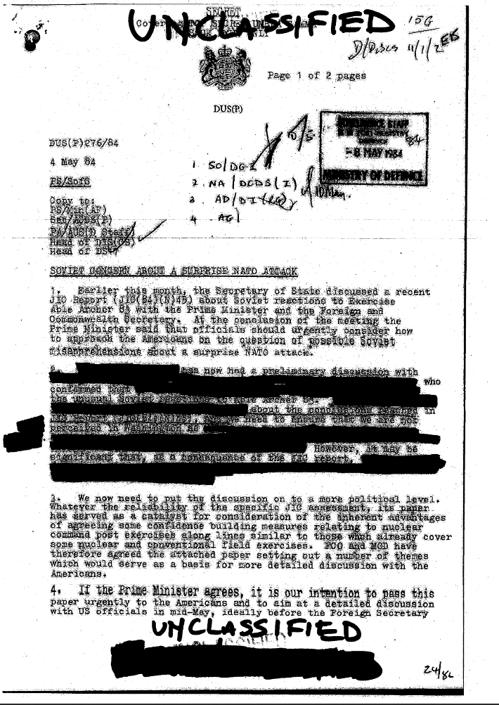 In an excellent article accompanying the posting of these documents, Burt reveals the existence of another comprehensive British report on Able Archer 83 that has not yet been released. The March 23, 1984, report, “JIC(84)(N)45 “Soviet Union: Concern About a Surprise NATO Attack,” reached “no firm conclusion,” but warned that “we cannot discount the possibility that at least some Soviet officials / officers may have misinterpreted Able Archer 83 and possibly other nuclear CPXs [command post exercises] as posing a real threat.” The information contained within this still-classified, JIC led Cabinet Secretary Sir Robert Armstrong to advise Prime Minister Margaret Thatcher that the evidence available “shows the concern of the Soviet Union over a possible NATO surprise attack mounted under cover of exercises.” Mirroring a similar assessment by Director of the CIA William Casey, he argued that the Soviet response to Able Archer “does not appear to have formed part of the Soviet exercise programme … it took place over a major Soviet holiday, it had the form of actual military activity and alerts, not just war-gaming, and it was limited geographically to the area, Central Europe, covered by the NATO exercise which the Soviet Union was monitoring.”