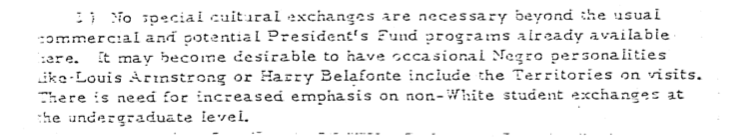 “It may become desirable to have occasional Negro personalities like Louis Armstrong of Harry Belafonte include the Territories on visits.”