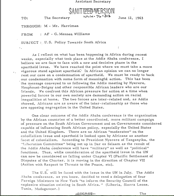 The Secret June 12, 1963, memo from Gov. Mennen Williams to Secretary Rusk.