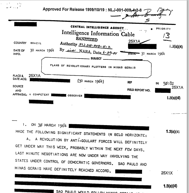 To its credit, since the mid 1970s the U.S. government has been declassifying secret documents on its role in the Brazilian coup, through routine declassification procedures and the U.S. Freedom of Information Act. Even the White House tapes of Presidents Kennedy and Johnson discussing the intricacies of coup plotting, regime change, and military intervention in Brazil with their aides are now available for public scrutiny. From these records we know many of the secret details of “Operation Brother Sam”—the Pentagon’s plan to provide guns, gasoline, and even combat troops if needed, to secure the success of the military coup. “We wouldn’t want the Brazilian military to move until we have everything in place,” states one Top Secret White House memorandum dated March 30, 1964. Nevertheless, the covert actions of CIA agents in Brazil at that time remain deeply classified.