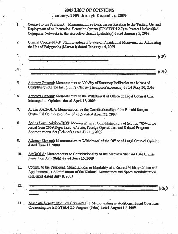Forty-Seven Office of Legal Counsel Memo Titles that the DOJ Did Not Use B(5) to Redact