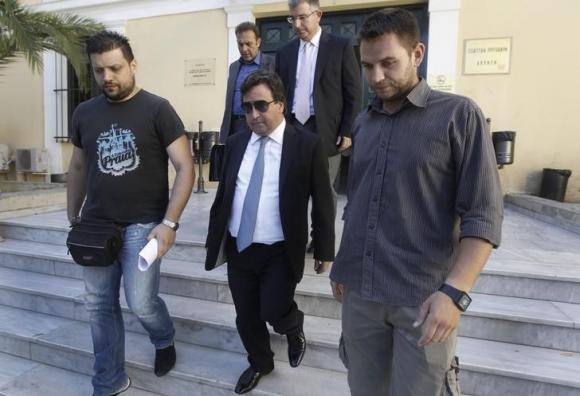 Greek shipowner Victor Restis (C) leaves a court in Athens July 23, 2013. REUTERS/John Kolesidis