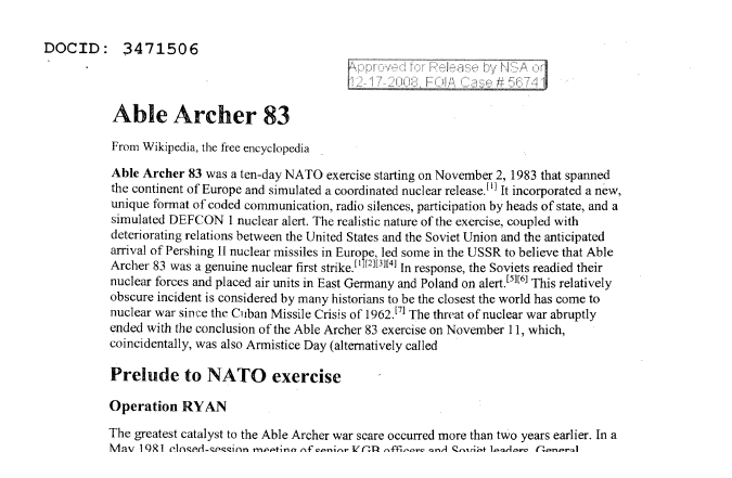 The Wikipedia article on Able Archer 83 the National Security Agency sent us in response to a FOIA request.