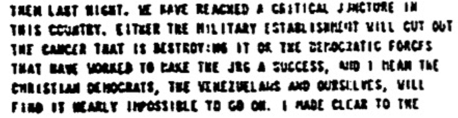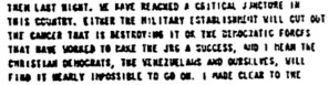 “We have reached a critical juncture in this country. Either the military establishment will cut out the cancer that is destroying it or the democratic forces that have worked to make the [government] a success, and I mean the Christian Democrats, the Venezuelans and ourselves, will find it impossible to go on.”