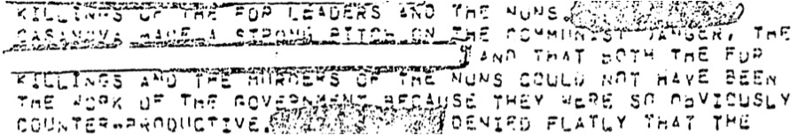 “[Deleted] Casanova made a strong pitch on the communist danger, the [deleted], and both the FDR killings and the murders of the nuns could not have been the work of the government because they were so obviously counterproductive.”