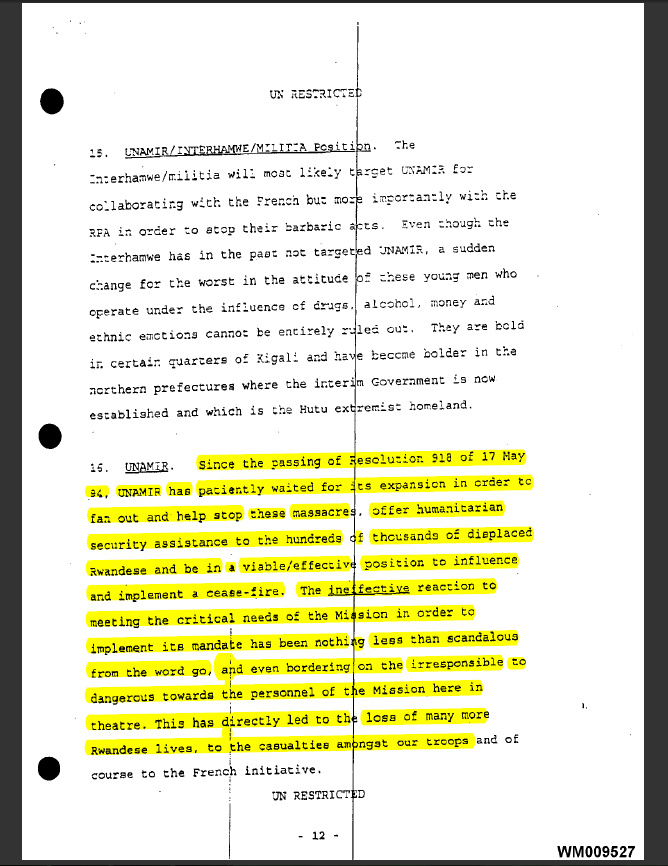 Since the passing of Resolution 918 on 17, May 94, UNAMIR has patiently waited for its expansion in order to fan out and help stop these massacres, offer humanitarian security assistance to the hundreds of thousands of displaced Rwandese and be in a viable/effective position to influence and implement a ceasefire. The ineffective reaction to meeting the critical needs of the Mission in order to implement its mandate has been nothing less than scandalous from the word go, and even bordering on the irresponsible to dangerous toward the personnel of the Mission here in theatre. This has directly led to the loss of many more Rwandese lives, [and] to the casualties amongst our troops.