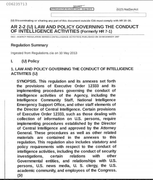 The CIA recently released 49 documents in response to a FOIA lawsuit filed by the ACLU and the Yale Law School that raise alarming questions about the extent of the agency’s domestic spying. The documents, many of which are policy briefings on how the CIA complies with Executive Order 12333, “strongly suggest that the agency engages in an extensive amount of domestic spying operations that are largely kept secret from the American people.” The key takeaways from the documents are: the CIA regulation referred to as “AR 2-2” governs a wide spectrum of the CIA’s activities; the agency’s domestic activity is often done in conjunction with the FBI; and “The rules for the handling of Americans’ information are so complex that the CIA struggled to apply them properly.” The documents raise questions about, among other things, what the CIA’s definition of “monitoring” domestic targets is, when monitoring devices may be used, and how “monitoring” differs from “electronic surveillance.” The Privacy and Civil Liberties Oversight Board is currently reviewing the Intelligence Community’s counterterrorism-related activities under EO 12333, and will hopefully shed more light on the CIA’s domestic actions.