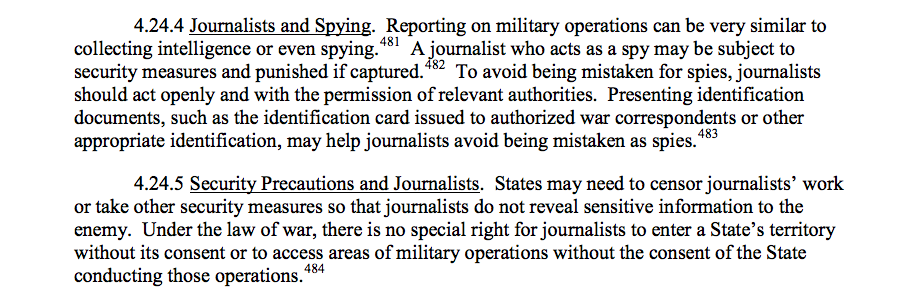 The New York Times Editorial Board published a damning rebuke of the Defense Department’s 1,176-page Law of War Manual this week. The Board took particular issue with the DOD’s guidance on journalists, including its instructions that members of the press may in some cases be categorized as “unprivileged belligerents.” The manual goes on to note, “that ‘Reporting on military operations can be very similar to collecting intelligence or even spying,’ so it calls on journalists to ‘act openly and with the permission of relevant authorities.’ It says that governments ‘may need to censor journalists’ work or take other security measures so that journalists do not reveal sensitive information to the enemy.’” The Board calls on the secretary of defense to revise its guidance on journalists.