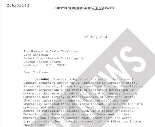 The CIA released hundreds of documents to Leopold and Ryan Shapiro this week during the course of a FOIA lawsuit for documents concerning the CIA’s spying on Senate Intelligence Committee staffers investigating the agency’s torture program. One remarkable document, whose inclusion in the release was apparently a mistake, is a July 28, 2014, draft letter by CIA director Brennan apologizing to senators Dianne Feinstein and Saxby Chambliss. In the letter, Brennan admitted that the CIA’s actions were wrong and went against an agreement between the Committee and the Agency. The letter was prompted by CIA inspector general David Buckeye’s report finding the CIA officers involved broke federal law. Brennan never sent the letter, however, opting instead to send the senators a letter informing them that he would set up an independent review board to investigate the matter. The review board, handpicked by Brennan, cleared the officials of any wrongdoing and concluded that the officials had acted reasonably in the face of a potential security breach.