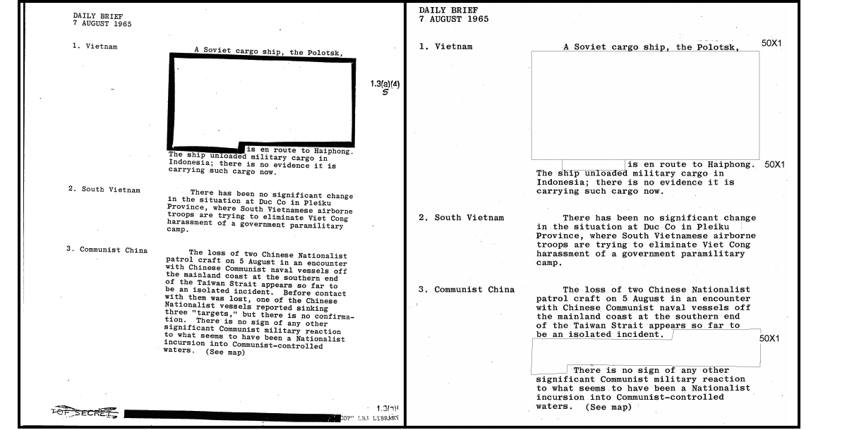 The CIA recently congratulated itself for its unprecedented release of 2,500 declassified President’s Daily Briefs (PDBs) from the Kennedy and Johnson administrations (a direct result of a court battle waged by the National Security Archive). In several instances, however, the CIA inexplicably redacted more portions of documents than in earlier releases. For just one example, see The President’s Daily Brief of August 7, 1965, which was made available to the public on July 15, 1993, and contains information that was withheld from the 2015 release; the CIA apparently found a passage concerning Chinese Nationalists’ reports of sinking three Chinese Communist vessels – over 50 years ago – exempt under the (b)(1) national security exemption. Read more about “flimsy redactions” in the PDBs by the Archive’s John Prados here. These proven examples of harmless information that should not have been censored seriously call into question the legitimacy of the thousands of pages of information that the CIA is withholding from the PDBs.