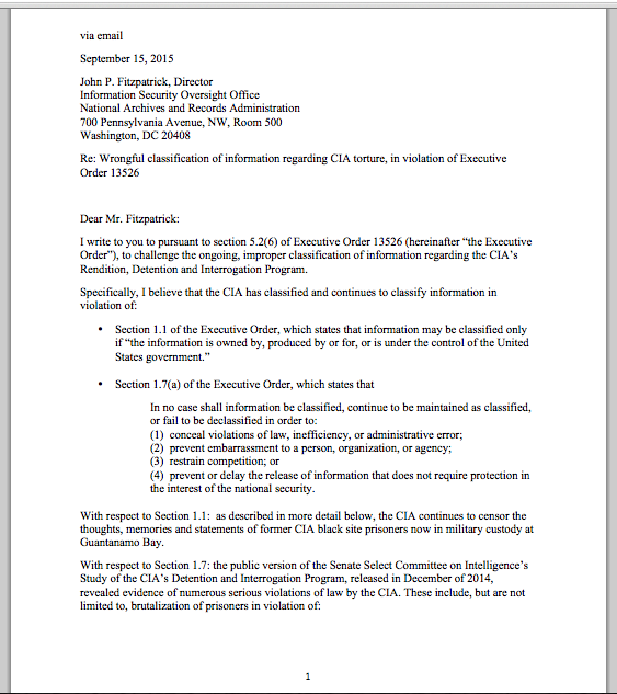 OpenTheGovernment.org’s National Security Fellow Katherine Hawkins recently filed a complaint with the Information Security Oversight Office (ISOO) – the office responsible “to the President for policy and oversight of the Government-wide security classification system and the National Industrial Security Program” – challenging the continued classification of the CIA torture report. Hawkins argued that the government is classifying information including, but not limited to, the names of countries that hosted the CIA’s black site prisons and the CIA’s involvement in the torture of prisoners in Iraq, “in violation of the Executive Order that governs national security classification.” Hawkins writes, “Secrecy regarding black sites’ and torture has played a major role in ensuring that no CIA personnel could be prosecuted for torture, war crimes, destruction of evidence, or other relevant federal crimes.” She goes on to note that the secrecy “has ensured that civil courts were closed to victims of torture, indefinitely delayed trials of the accused perpetrators of the September 11 attacks, and put the United States in breach of its obligations under the Convention Against Torture.” The complaint is available here. For its part, Amnesty International filed a formal complaint with the Justice Department’s Inspector General “demanding an investigation into the lackluster and ‘inconsistent’ response” of DOJ officials to prosecute those responsible for the CIA’s torture program.