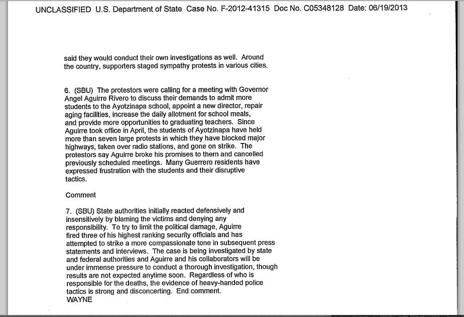 A declassified cable from the US Embassy in Mexico City – obtained by the Archive under the FOIA – shows US Ambassador to Mexico Earl Anthony Wayne saying that “evidence of heavy-handed police tactics” was “strong and disconcerting” after a 2011 clash with student protestors from Ayotzinapa normal school left two youths and a gas station employee dead and several others wounded. The cable is the focus of an article published this week by the award-winning team of investigative journalists at Mexico’s Aristegui Noticias.