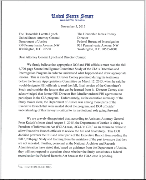 Letter from Congress urging the DOJ to disseminate torture report.