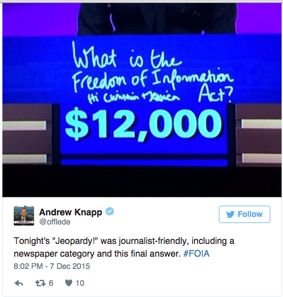 December 7th’s Final Jeopardy clue was “The website for this ’60s act says “First look to see if the information you are interested in is already publicly available”. The answer? The Freedom of Information Act, of course! FOIA Advisor’s Kevin Schmidt highlighted FOIA’s pop-culture moment here.