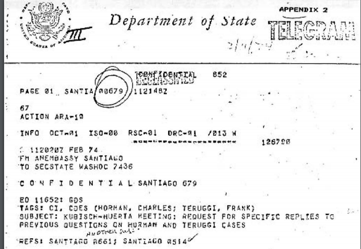 With ongoing legal proceedings for the crimes of Condor in Argentina and Chile, and continuing legal efforts in the Horman and other human rights cases, these new documents continue to be relevant—even if they don’t fundamentally alter our knowledge of the history of Pinochet’s repression and U.S. policy and operations during the first three years of his regime. In effect, these documents provide a chronological roadmap to a particularly painful and dramatic history that, even four decades later, refuses to fully recede into history. The revelations of these records are sure to stimulate efforts to push for the declassification of more documentation—including Chilean documents because there are still secrets yet to be exposed.