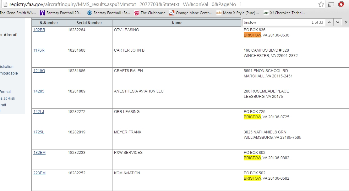 Documents: http://registry.faa.gov/aircraftinquiry/MMS_results.aspx?Mmstxt=2072703&Statetxt=VA&conVal=0&PageNo=1 (Control F for “Bristow VA” for the lists of fake companies)