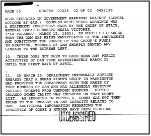 An April 4, 1985, State Department cable shows Mejía Víctores charging GAM was “being manipulated by the insurgents”.