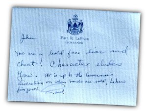 A June 2012 note from the governor to state Sen. John Patrick, D-Oxford